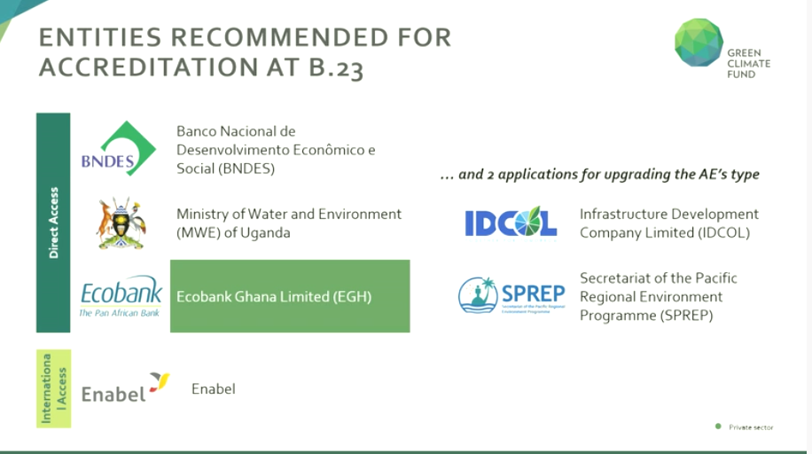 The Board was presented with four new entities seeking accreditation to the Fund (three direct access and one international access) and two DAEs for upgrade. There were no objections from the Board, and the following entities were accredited and approved for upgrade: