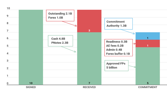 • US$2.1 billion outstanding from signed contributions, and US$1 billion allocated for forex losses
